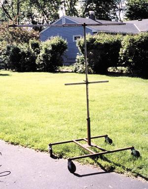 It's simply a metal pole riding on four caster wheels with two adjustable crossbars - one at about 4 ft. off the ground and the other at about 6 ft. It looks like you just push it along the hedge as you trim to keep a consistent height. Not much to it but I bet it works well. (Dennis Lash, Eagan, Minn.)
