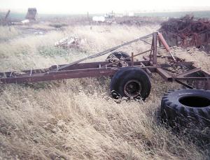 This portable manure cleaner was built by a neighbor of mine who operates a large feedlot. He uses the machine to drag sludge out of a shallow, flat-bottomed lagoon on one side of his feedlot. It has a 10-ft. dozer blade on back that's raised and lowered by a hydraulic cylinder that operates off tractor hydraulics. A hydraulic-operated steerable semi truck axle on back makes it easy to position the blade. The frame is off an old A-frame type combine trailer.