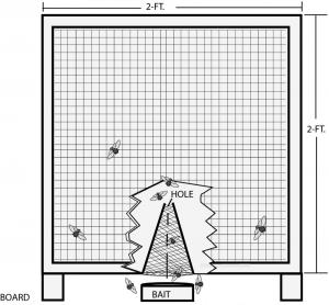 It consists of a 2-ft. square wood cube covered with window screen. A 4-in. dia. inverted cone is set in the bottom. There's a finger-sized hole in the bottom of the cone where it extends up into the cube.
