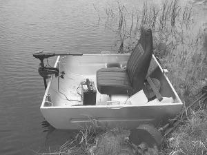 The boat measures 4 1/2 ft. wide by 5 ft. long and is fitted with a bucket seat from an old van. A trolling motor locks onto a metal tube mounted horizontally across the front part of the boat. A pair of pipes on front hold fishing rods. Drink holders are welded into both corners on front.