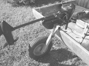 To move the boat by himself, Groening moves the motor to a horizontal position and then slides the shaft on a single wheel into the tubing. Then he lifts the back of the boat up a bit and wheels it into the water. "Once I get the boat in the water, I just slide the wheel out and throw it behind the seat."