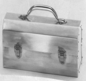 A children's size lunchbox is 8 3/4 in. long, 4 3/4 in. wide and 7 1/2 in. high. It sells for $27.95.