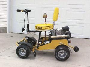 I came up with this self-propelled "bar stool" that's a real conversation piece. It's powered by a 5 hp Honda gas engine and rides on the wheels and axles off a racing go cart. The driver sits on a real bar stool. The engine chain-drives the rear axle. The twist throttle is off a motorcycle, and the hydraulic brakes are off the go cart. The driver uses a straight pole on front to steer the rig, using the handlebars off a mountain bike. A lever is used to operate the brake. There's a light on front and a brake light on back. Both lights are powered by a small generator that runs off the disk brake. It has a lot of power for its size and if I hit the throttle too hard I can do a wheelie, so I added a pair of small wheels to keep from flipping over backward.