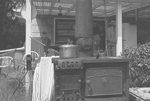 I use this old 30-in. high by 42-in. wide wood and coal-burning cook stove outside during the summer. The stove was made in about 1930 and was originally used as a kitchen range in our house for cooking and baking. Then it partially burned out and we didn't want to keep it in the house any longer for fear of fire. So we moved it outside, made a few minor repairs, painted it and put it to use for summer cooking so we don't heat the house up. There are six lids on top. I can remove the lids over the fire box and install a grill over the fire box so we can use the stove as a barbeque while warming food inside the oven at the same time.