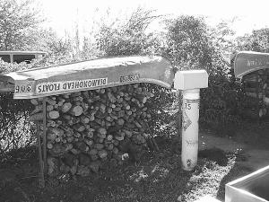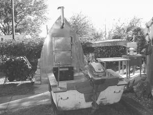 Ballard cut 2 ft. off the back end of the boat to make a bench that faces the smoker. He mounted the rest of the boat upright in a 2-ft. block of concrete. He installed a fireplace insert at the bottom, and welded four separate cooking racks and a large water pan into place above that, closing the boat-smoker in with aluminum tread plate.