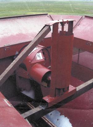 To remedy the problem, Woodside made a "bubble up" auger by removing the original cross fill auger and replacing it with an auger that just goes to the center of the bin, where it fastens to a right angle gearbox which then drives another auger that goes straight up.