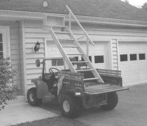 The steps are made from wooden 2 by 8's and measure 10 1/2 ft. high by 4 ft. wide. The bottom end bolts onto a wooden frame that attaches with four bolts to the Gator bed. The top end is equipped with a hinged wooden box, which can be folded down and used as a step or folded up and used as a toolbox or storage container. A foldable handrail bolts onto one side of the stair step. By pulling a single pin, the handrail can be folded back out of the way.