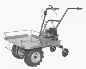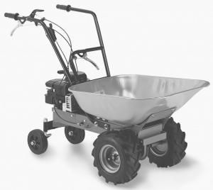 A rope-start 3 1/2 hp Briggs and Stratton engine powers the forward and reverse drive. It can carry up to 220 lbs.