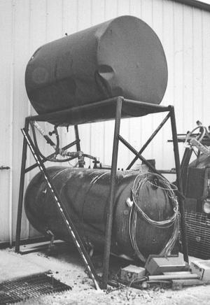 "It lets us pump used oil straight from the oil pan into storage tanks instead of having to carry it in buckets," says Elston. "A switch that mounts on a control panel inside the half barrel is used to turn the electric motor on or off. To make the portable oil pan we cut the bottom six inches off a 55-gal. metal barrel, then cut a hole in one side and attached a 1-in. dia. hose to it."