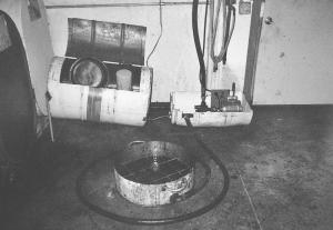 Whenever the 55-gal. barrel gets full, Elston opens an in-line valve to suck oil from the barrel through a hose that leads outside to the two storage tanks.