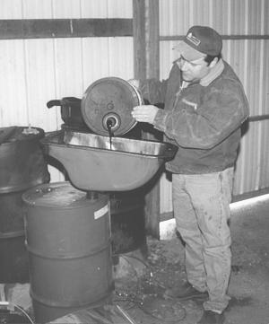 A big advantage of using the large tractor oil pan is that Miller can pour a 5-gal. can of oil into it without having to wait for it to drain down.
