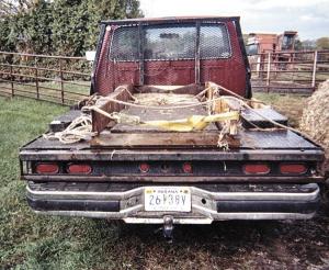 Before loading the bale, I tie one end of the rope to the right side of the flatbed and the other end to the left side. Once the bale is loaded on the rails, I throw the rope back over the bale and tie it down on the right side again for transport.