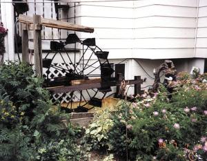 Water Wheel Made Out Of Two Hay Rake Wheels FARM HOME Novelty Items 30-3-41 My husband, Joe, is always creating something from nothing. This summer, he made a water wheel out of two hay rake wheels. The scoops are from a grain elevator. The water appears to be coming out of a pair of split wood rails up above. The birds and I love the sound of moving water. (Virginia Strueder, 3648 S 108th St., Franksville, Wis. 53126; v.strueder@netzero.net)
