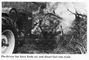 "Fifty-five gallons of No. 2 diesel fuel will last 12 to 15 hours," explains Ricky Hardee, assistant sales manager. "You simply hook the fan up to a 540 rpm pto shaft, mounted on the 3 pt. hitch, and back up to a pile of trash. Using the handgun, you completely wet the material to be burned and start the fire. Then start the fan to produce the wind force and, when needed, apply additional fuel with the handgun outfitted with the high-speed tip. When the fire is completely started, move to a new area and repeat the process."