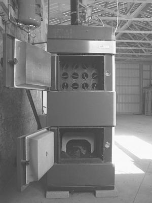 The combustion chamber is constructed from acid-proof stainless steel and the boiler interior has 1/4-in. water-cooled steel plates. A gear motor turns the worm conveyor/auger to feed fuel into the combustion chamber at the proper rate.