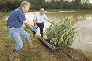 St. Augustine grass, common bermudagrass, Tifton 85 bermudagrass, and giant reed are all being tested in the mats. The first three grass mats can all be used as sod when removed from the water. The giant reed has potential as a biomass source for biofuel.