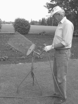 Primrose fills the basket with fresh potatoes, carrots or anything else that needs washing, and then holds the garden hose over it as he slowly turns the handle to rotate the basket.