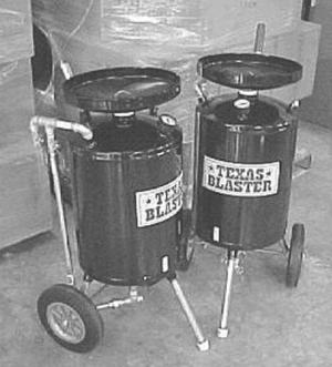 The Texas Blaster holds 140 lbs. of blast media and runs on 7 cfm @ 80 psi. It'll clean 1 sq. ft. per minute and blast for an hour and a half on a tank of sand. It has a 14-gal. tank and an easy-pour funnel for fast loading.