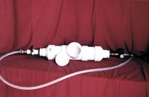 The injector is made from a 4-in. pvc cleanout tee with a threaded plug in the tee. A pressure regulator connects to an air compressor with an air hose, a threaded pvc ball valve, a 6-ft. long clear plastic hose, and a hose adaptor.