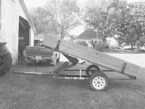 He got the trailer from his brother-in-law. The floor was rusted out so he removed it. He used 2-in. sq. tubing to build a 5 by 9-ft. frame on top of it and hinged it at the back. He rebuilt a hydraulic hoist cylinder and scissor assembly from an old hydraulic dump wagon and mounted it between the two frames. One end of the cylinder is hooked to the trailer's original frame, and the other end is hooked to the add-on frame.