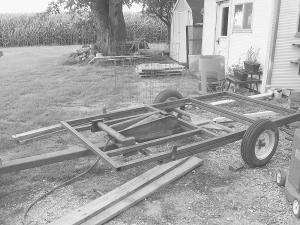 He used 2 by 6's to build a new wooden floor and mounted 2 by 12's on the front and sides of the trailer, adding a tailgate on back.