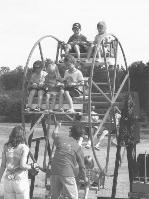 The ferris wheel stands 10 ft. high and rides on a trailer chassis. It has four seats with seat belts and holds up to 8 people at a time. Painted orange with Allis Chalmers decals, the seats mount on an 8-ft. dia. wheel that originally held plastic natural gas pipe line. A solid steel tube serves as the axle. Power is provided by a 12 hp Briggs & Stratton engine which belt-drives the rear end off an old Allis Chalmers riding mower. The rear end belt-drives a variable speed friction transmission off a Dixon riding mower, which in turn belt-drives a roller chain system that results in triple reduction. "Using this system I can make the ferris wheel go forward or backward, and precisely control the speed," says Polacek.