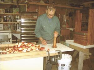 What better way to dispose of excess apples than by making them into cider? Bruce Chandler built a hydraulic jack-powered press to squeeze out the juice. His first step to making great cider is to run it through a garbage disposal set up specifically for that purpose.