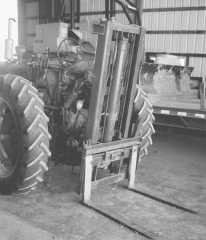 "The forks can lift 3,000 lbs. up to 8 ft. high with no problem," says Hicks, who paid $100 for the forklift mast. He replaced the cylinder seals and hoses. The mast is mounted solid to the tractor drawbar and to the tractor itself. He cut off the subframe that had secured the mast to the Ford tractor and then made a new bracket that attaches the top part of the mast to the tractor's rear axle. The mast has four hydraulic cylinders. Two are used to tip the mast forward and backward, one is used to shift the forks from side to side, and a big 5-in. dia. cylinder is used to raise and lower the forks via a pair of roller chains.