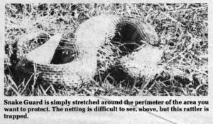 Snake Guard comes inlengthy rolls 12 to 15 in. high. You simply peg it to the ground around the area you want to protect, making sure there's no room to crawl under, and remove the snakes as they're trapped.