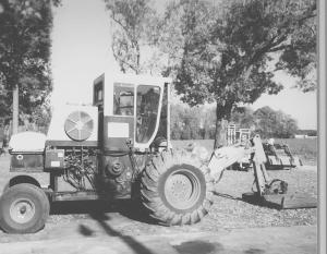 The engine sits behind the cab with the double V-belt that had powered the grain table now running to the main hydrostatic drive. Electric clutches at each end of the engine power pumps for the arm and the cutterhead. Two separate hydraulic reservoirs provide oil, one for the cutter arm and head and the other for steering and hydrostatics drive.