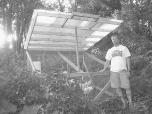The chicken coop is an 8 by 8-ft. pen that's 4 ft. tall at the front and slopes to 3 ft. at the back. The cedar frame is covered with chicken wire. Cedar reduces weight and holds up well to the weather. Clear plastic roofing panels protect the birds yet still let in light. Skids made from pressure-treated 2 by 4's make it easy to move the pen around. The open bottom lets the birds pick and scratch, clearing out weeds and bugs as they go. A 3 by 3-ft. door on the front side is big enough for the kids to get in and fill the feeder and waterer, while hinges on the roof's front side let Al or Rochelle lift it up from the back for easy entrance.