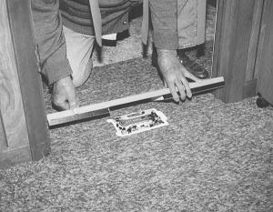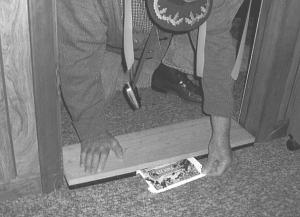 I figured these pests would have to use the doorway for moving about. But doorways are too wide. Then I hit on the idea of building a threshold with a controlled passageway, which would require that pests use it when going from room to room.