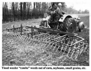 The Einbdck tined weeder "combs" weeds out of almost any standing crop including corn, soybeans, small grains, potatoes, and so on. Fitted with 6 rows of gently curved 20-in. long steel tines, the new weeder can be used on crops up to about 1 ft. tall. In corn, Beekman first uses the weeder about 5 days after planting to get rid of small weeds. It also breaks up the soil crust to improve seed emergence and increase water absorption and can be used on hay ground to stimulate growth.