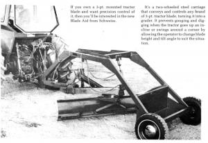 "Just two bolts and one pin hold the blade to the Blade Aid. A double valve hydraulic system provides accurate, fingertip blade control," says manufacturer Harold Schweiss. "One hydraulic cylinder controls depth of cut while a second cylinder controls the blade's tilt angle. It's accurate enough to do light terrace or road building work yourself," he adds.