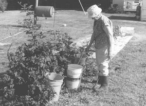 We used the same idea on a few blueberry and blackberry plants, only this time we used 5 to 7-gal. plastic buckets. First we drilled a 1/4-in. dia. hole in the bottom of each bucket. Then we placed the buckets near the plants and filled them with water.