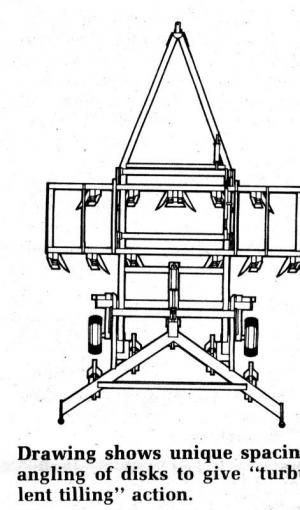 The machine's V-chisels are spaced 30 in. apart. It's available with five shanks for a 121/2 ft. swath, or with seven shanks for a 171/2 ft. swath. Both versions are equipped with width spaced, spring-loaded disks arranged in two rows and in staggered opposing positions. The five shank unit generally requires a 200 to 300 hp., four-wheel drive tractor. For deep chiseling, a seven shank unit requires a 275 to 400 hp. fourwheel drive tractor.