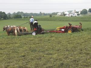 This motor-powered, horse drawn New Holland haybine was an example of tractor-powered equipment that has been adapted successfully for horse-drawn use, thanks to forecarts. Other equipment at the show included hay tedders, rakes, balers and a four-bottom plow.