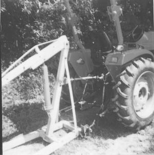 He welded a couple of brackets made out of 3-in. angle iron to the hoist and drilled holes in them to fit the pins on the 3-pt.'s lift arms. About 26 in. up the back side of the hoist beam he welded two pieces of flat stock to attach to the top link.