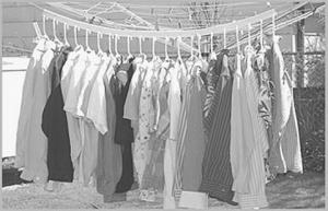 Tibbe-Line comes in a package of three 13-in. strips of flexible pvc with seven holes. The strips slip over a rope, bungee cord, or wire. Any type of hangar slips in the holes, and after the clothes dry they're ready to put away. Pacheco uses clipped hangars to dry pants and shorts. She also drapes towels and other small items on hangars.