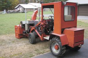 The tractor's hood and front grill are off a Farmall A or B tractor. Sections of canvas on both sides of the tractor keep snow off the engine and also helps direct the engine's heat back into the cab.