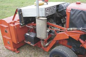 The blower is belt-driven by a separate diesel engine that has its own battery, starter and controls. There's a 1,000-lb. steel counterweight on back of the tractor to counteract the weight of the 5-ft. wide snowblower that rides on metal skids, with a length of grader blade welded on in front.