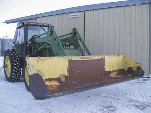 "The header was originally equipped with a Sund pickup and mounted on a 1400 New Holland combine. After the combine became inoperable because of a burned-out engine, the header was useless. Since no one uses these older headers any more, I decided to make a 13-ft. wide snow bucket out of it."