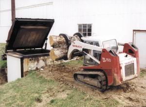 "We use a skid steer with a grapple to load up to three logs at a time. The logs measure 14 to 16 in. in diameter and are up to 6 ft. long," says Clair. "A pair of big hydraulic cylinders are used to open the lid. The cylinders are powered by a hydraulic pump inside the shop."