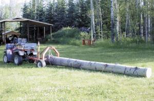 Several add-ons make skidding logs easier. One is a length of pipe welded to the forward arch to hold a cant hook. A chain hook is welded to the forward arch for cases where a log needs to be dragged a short distance before being lifted into position for skidding. Two stump deflectors made from 1-in. steel rod are mounted ahead of the wheels. The front hitch has a handle made from one jaw of a pipe wrench.