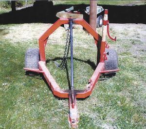 Stubbs' skidder loads itself. No hydraulics or winches are needed. Stubbs used a fairly standard skidder design with a top arch and a forward arch. The lift mechanism is a 1 1/4-in. round steel bar with a sliding ring and hook. The bar is welded to the front of the yoke, just behind the hitch and extends back and up at a 45 degree angle to a point 6 in. ahead of the top arch. The last 6 in. of the bar are parallel to the ground, forming a sliding ring rest.