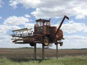 That's because the 68-year-old machine also saw a lot of country in its younger days, as it made its way around Alberta and the U.S. with a custom harvesting crew. Today the combine is a unique landmark near Grande Prairie, Alberta, a sentimental reminder of three generations of farming for its owner. It meant so much to Bacon that he literally put the combine on a pedestal.
