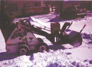 They bought a 48-in., 2-stage snowblower that was originally designed to mount on front of a Turf Track garden tractor. The snowblower was originally belt-driven off the tractor's engine. They bought a Kohler 16 hp electric start engine at an auction and built a frame to mount the engine above the snowblower's gearbox, allowing the engine to belt-drive the snowblower.