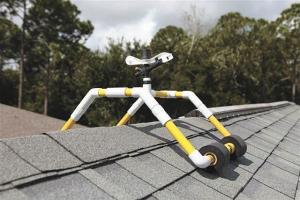 The Rooftop Fire Defense System (RTFDS) is made from specially treated pvc pipe that's fire and heat resistant and has a sprinkler head on top. There's a pair of sponge-type rollers on each side that grip the roof. It also comes with 4-ft. lengths of feeder pipe that run to the roof edge.
