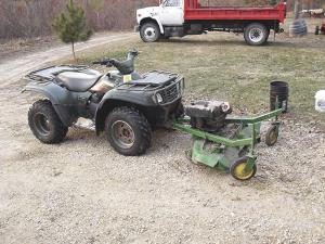 Double-Hitched Lawn Mower On ATV FARM HOME Lawn Mowers (31h,38) 34-3-35 Josh Konze didn't have a lawn mower on the family's hunting property, but he did have an ATV and a pile of parts. His cousin contributed an old 48-in. mower deck and an 11 hp engine from a Toro mower, and Konze welded on other parts to create a front-mounted mower.