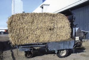 We cut down the sides of an old Robibec automatic self-propelled feed cart and made it into a large bale feeder for use in the barn. It works great. No lifting. We use a skid steer to load it and then drive it through the barn. We've used for 3 years. (Francis Henderson, 11381 Henderson Road, Brinston, Ont., Canada K0E 1C0 ph 613 652-4652)